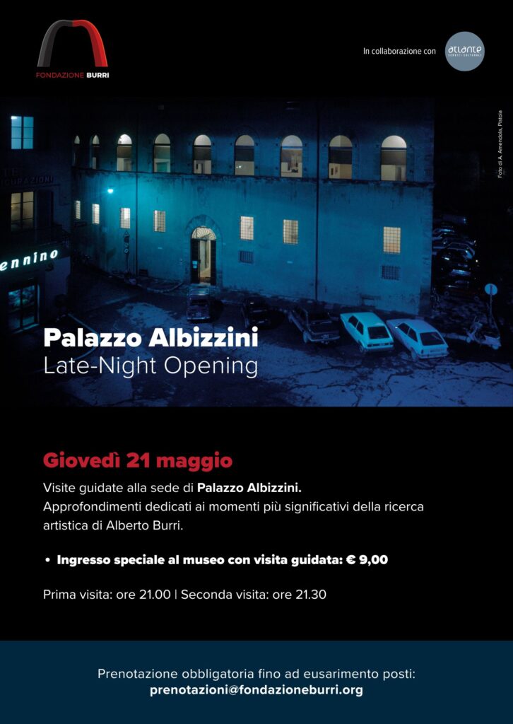 Giovedì 21 maggio il museo effettuerà un’apertura serale straordinaria nella sede di Palazzo Albizzini. Nel corso della serata saranno organizzate due visite guidate, previste rispettivamente alle ore 21:00 e alle ore 21:30 su prenotazione. Il costo del biglietto, comprensivo della visita guidata, è di 9 euro. Prenotazione obbligatoria fino ad esaurimento posti a: prenotazioni@fondazioneburri.org